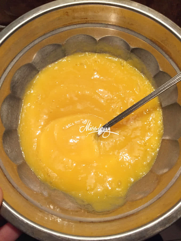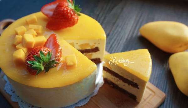 然后做镜面的时候我忘记拍了。。。方法是。。。把50g芒果肉加温水打成浆~然后小火加热至温热加入吉利丁粉【可换算为1片吉利丁片】搅拌均匀无颗粒~然后稍微放凉后~用勺子舀到芒果慕斯上~【我是原本的慕斯做的太高了才用的勺子~不过这个方法会很均匀!拿勺子一勺一勺舀上去然后用手转动模具直到镜面均匀铺满全模~要每次多一点才好铺满~】
