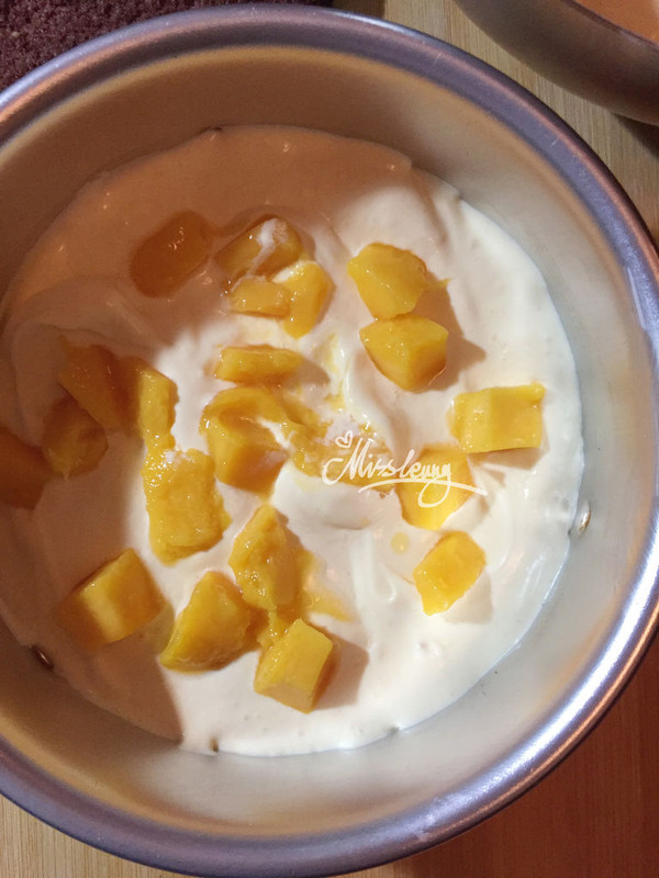然后加入一层搅拌好的慕斯糊~铺平然后加入芒果肉~多少按自己口味来~