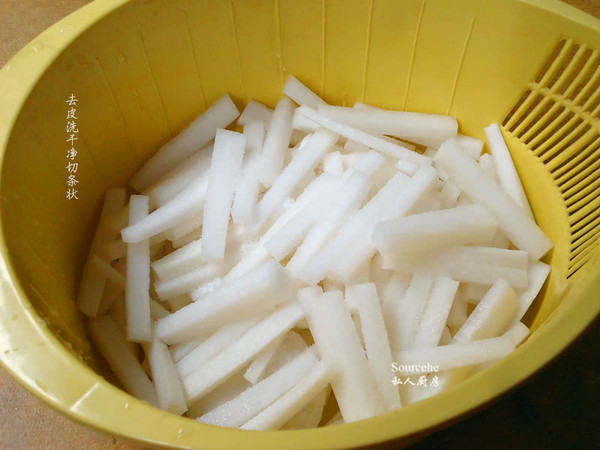 切好的萝卜条,撒上盐腌制30分钟;PS:萝卜条软化,有很多萝卜水出来,即可;