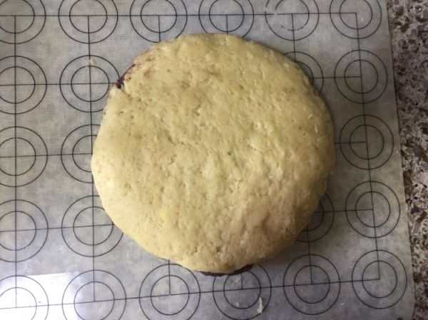 然后我们加入鸡蛋液和牛奶,混合成面团。牛奶的量可以适量调整。做的时候天气特别冷,面团也比较硬。
