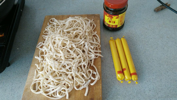 将200克面粉倒入面条机,逐渐加入70克水,一小勺盐。等候出面。
