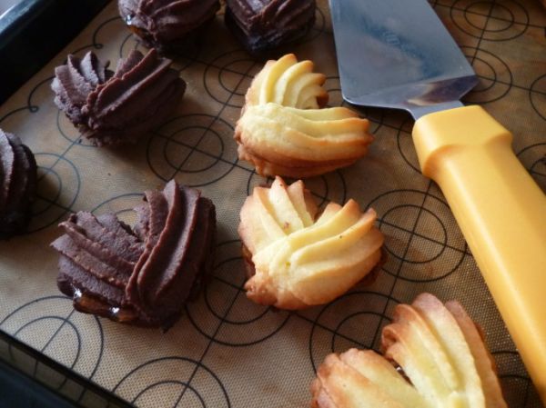 最后把组合好的曲奇饼干浸入隔水融化的黑巧克力中,等巧克力晾干即可。