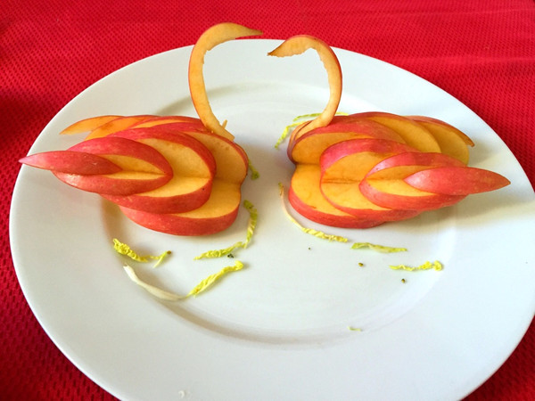 将薄片的苹果中间切开,取一半利用苹果的天然弯曲刻出天鹅的长脖子和头