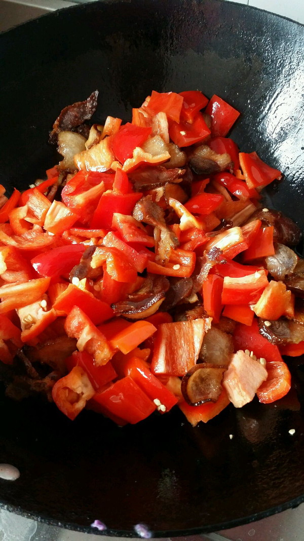 瘦肉紧接放入,炒片刻后,将红椒放入翻炒