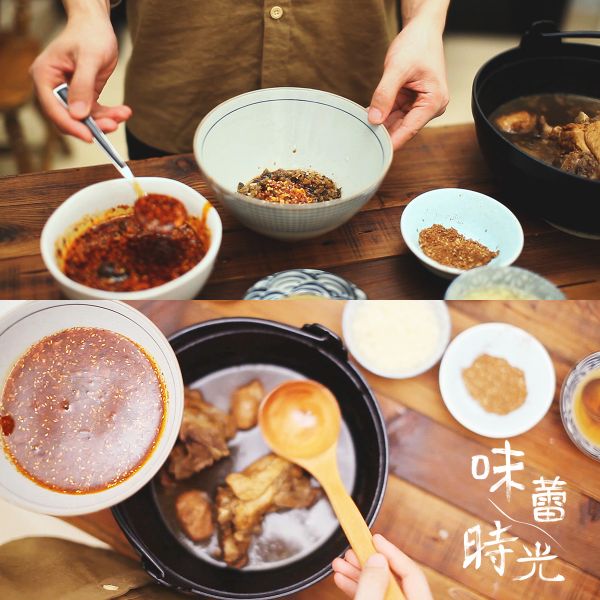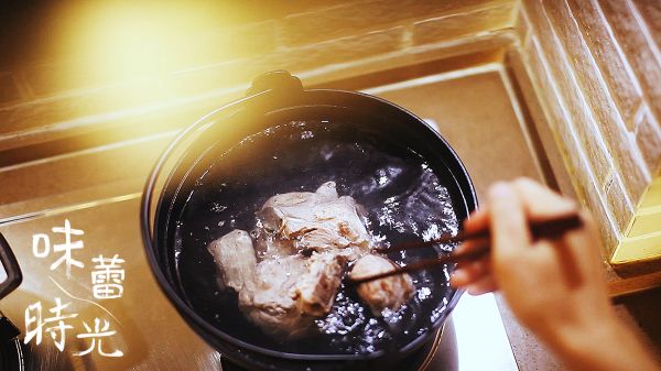 < 炖骨汤 > 方式: 洗净的猪大骨焯水去腥后,放入热水中,加入花椒,八角,酱油,料酒熬汤。水沸腾后中火熬制30分钟。