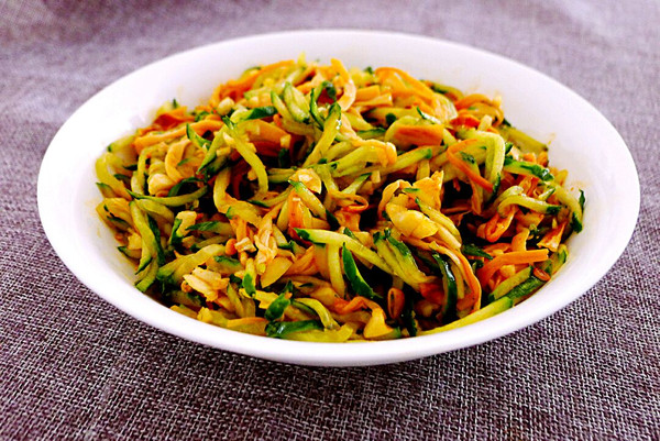 这道菜只需一步,黄瓜切丝,蒜切末,金针菇,盐,醋,糖拌匀即可,简单,爽口。