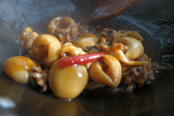 为避免墨鱼在烹炒中出水,先加葱段和姜片煮水,水开放章鱼片汆一下