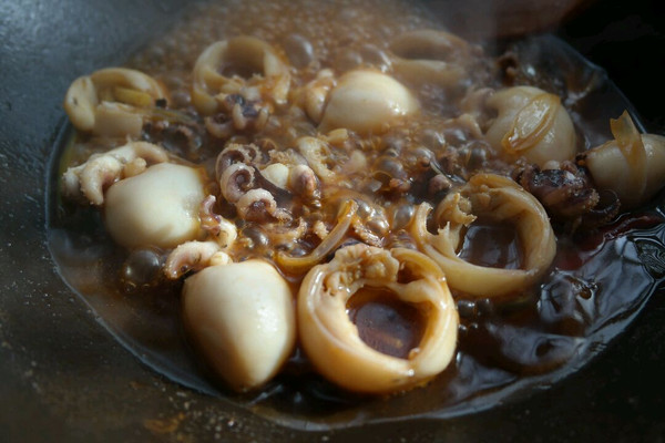 墨鱼捞出控水备用。 再取一锅加水150ml,水开后中火煮蒜瓣和洋葱粒(不盖盖子)