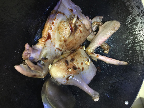半只鸭斩几件,锅放饭碗半碗油,烧红!下鸭子两面煎成金黄色