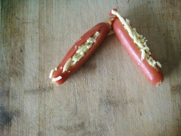 烤肠中间划开一道口子,不要切断,塞入马苏里拉芝士