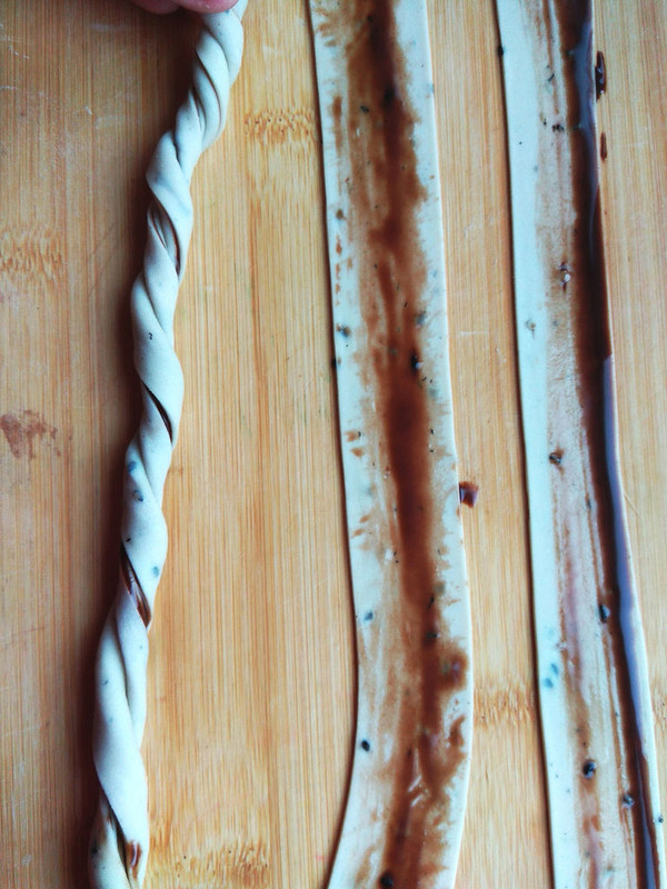 擀成圆片后,表面刷少许巧克力酱,切成宽条