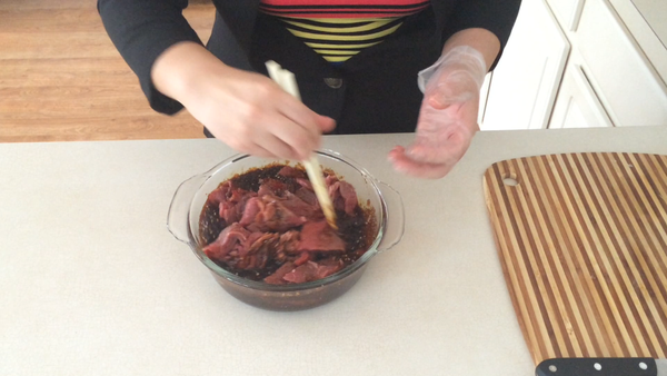 【第二步:腌制牛肉】将牛肉切成2-3厘米宽的薄片;把牛肉放入腌料中,盖上保鲜膜,放入冰箱,腌制半小时-24小时都可以,时间越长越入味!