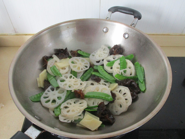 莲藕去皮切片泡入清水中,黑木耳,荷兰豆摘洗干净,冬笋片准备,红椒切片
