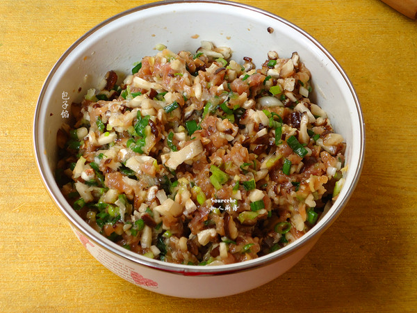 等发面的时候,做好馅,猪肉洗干净切,香菇、香葱,生姜等都洗干净剁碎,放盐、油、酱油、生粉、鸡精拌均,腌制15分钟;
