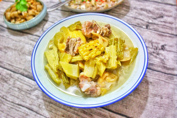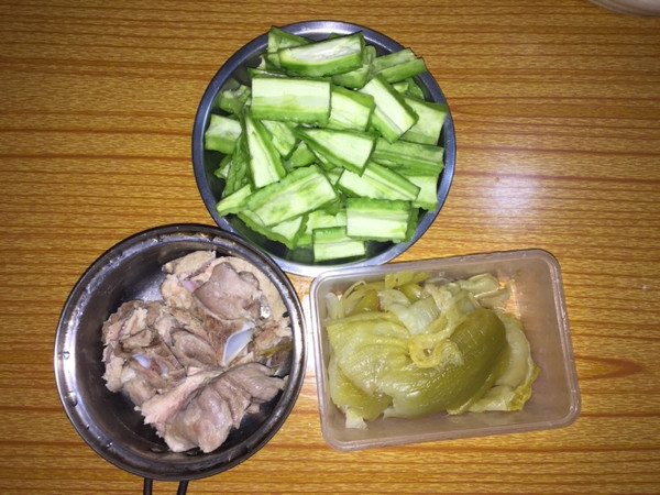 .准备材料,苦瓜去瓤,切小块。猪骨焯水。咸菜洗净,怕太咸可以切小块冲水或浸泡片刻。