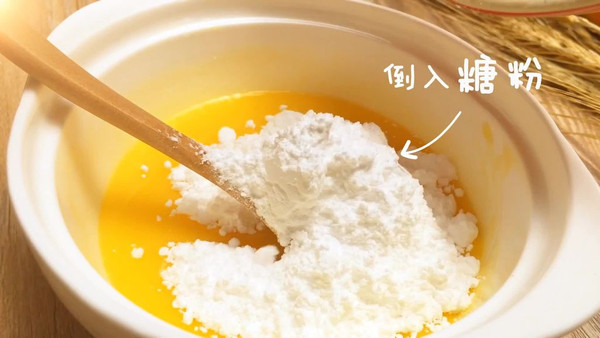 将糖粉倒入搅匀的黄油中,搅拌均匀。