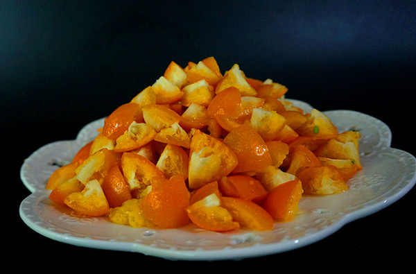 将洗过开水浴的金橘捞出来沥干水分,然后把金橘切成八小瓣,用牙签剃掉核