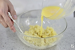 在土豆泥里一点一点倒入蛋奶液,边用勺子搅拌均匀,使蛋奶液和土豆泥融合在一起。