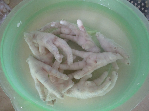 先把鸡爪冷水下锅焯水后捞起洗净