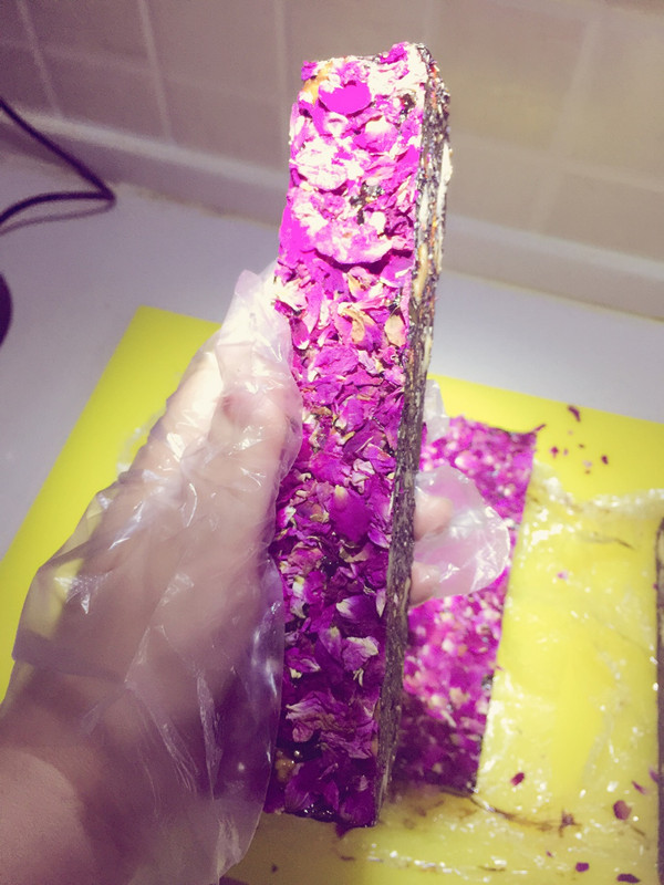 铺上玫瑰花瓣,压实。晾凉了放冰箱保鲜搁一夜。