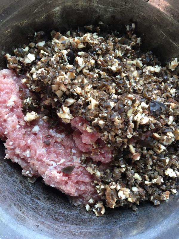 木耳和香菇放用开水提前泡一会,五花肉躲碎,(怕麻烦可以直接在买肉那让别人用搅碎机搅碎)