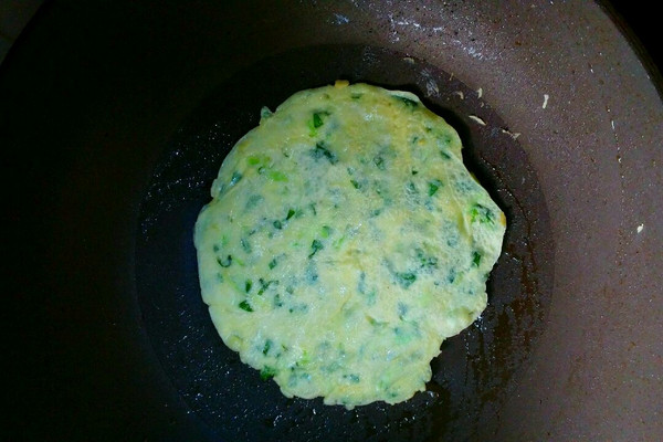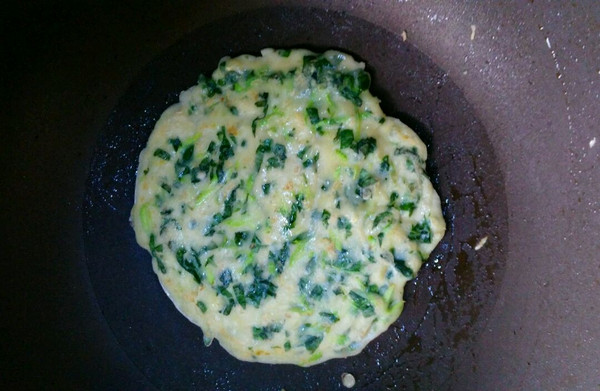 平底锅中放少许油,加5勺(喝汤用的小勺)面糊,摊成薄饼。饼小好翻面。