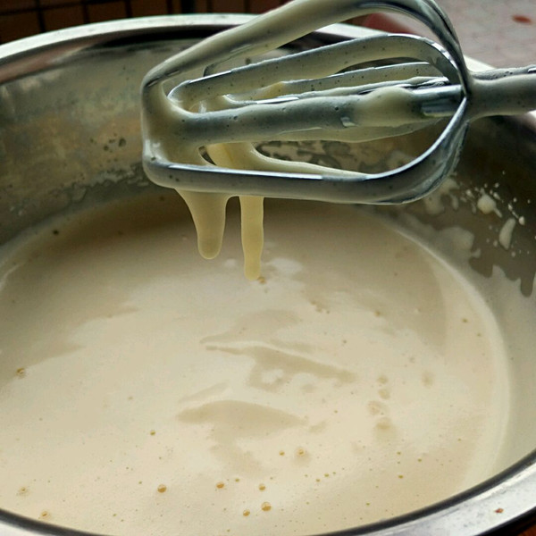 白糖分三次加入到鸡蛋里,全蛋打发。打发标准就是,提起打蛋器,蛋糊不会马上滴落,而滴落后不会马上消失。