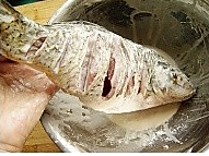 然后把鱼顺锅边划入油锅内,边炸边向鱼身上浇热油,中火炸至鱼皮变酥。