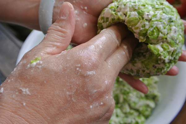 取适量的榆钱面团,团圆后用手在中间捣一个窝。