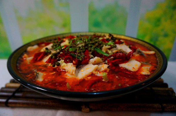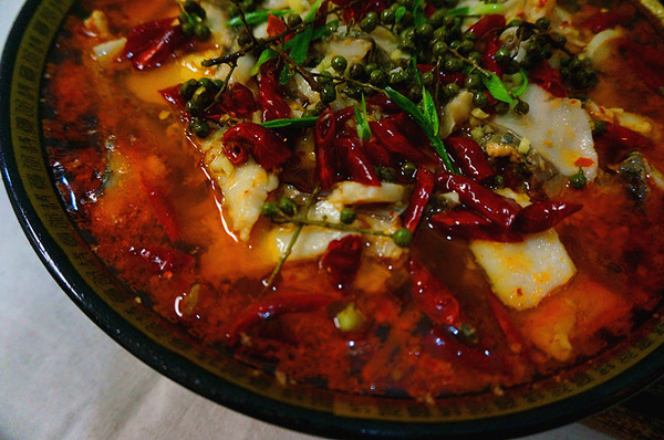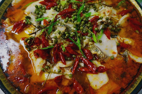 将鱼片儿捞出,撒上干辣椒,青花椒,葱段儿,蒜末,姜末