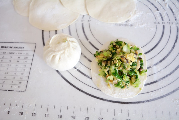 然后把小油菜切碎,香菇切碎,鸡蛋切碎,在放几颗小葱切碎,加入盐、鸡精、五香粉、酱油、食用油和香油拌匀调味即可。