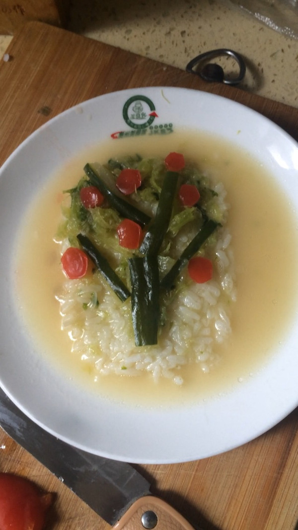 米饭打底,黄瓜和鸭子熬汤;芹菜煮熟打成泥,圣女果剪成圆形小果状,拼盘,浇上鸭汤