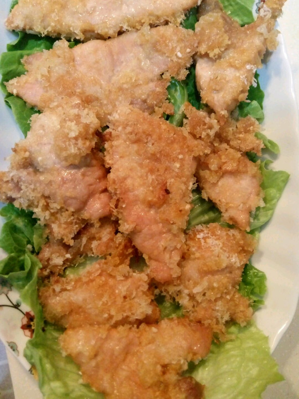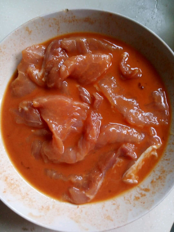 猪里脊切猪扒块大小,用蛋清,生粉,奥尔良粉腌制8小时。 1,奥尔良粉,我写的适量,大家根据自己口味来下。 2,里脊肉腌之前,用刀背敲敲,肉质会更嫩