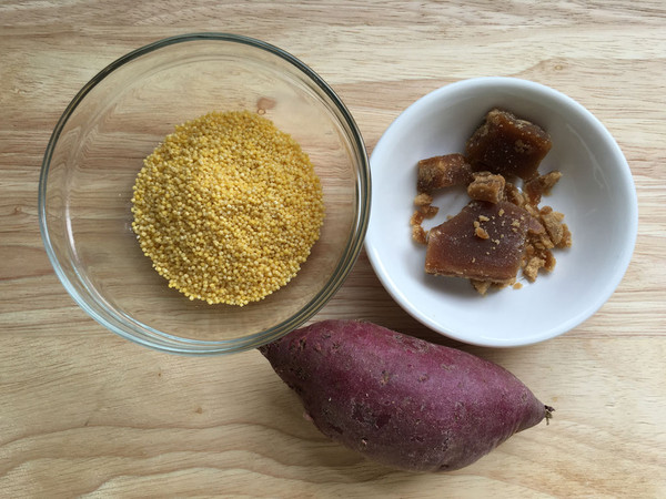 玻璃碗中倒入开水,同时把淘洗过的小黄米、紫薯块和红糖一起放入