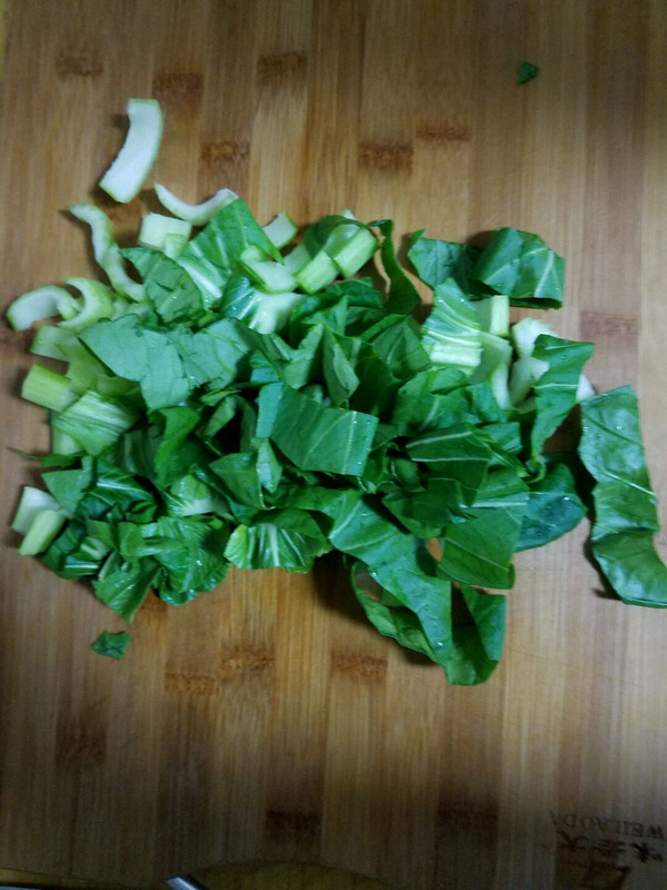 葱姜蒜爆香,加入红萝卜、西红柿、上海青,翻炒后加盐、生抽、胡椒粉。