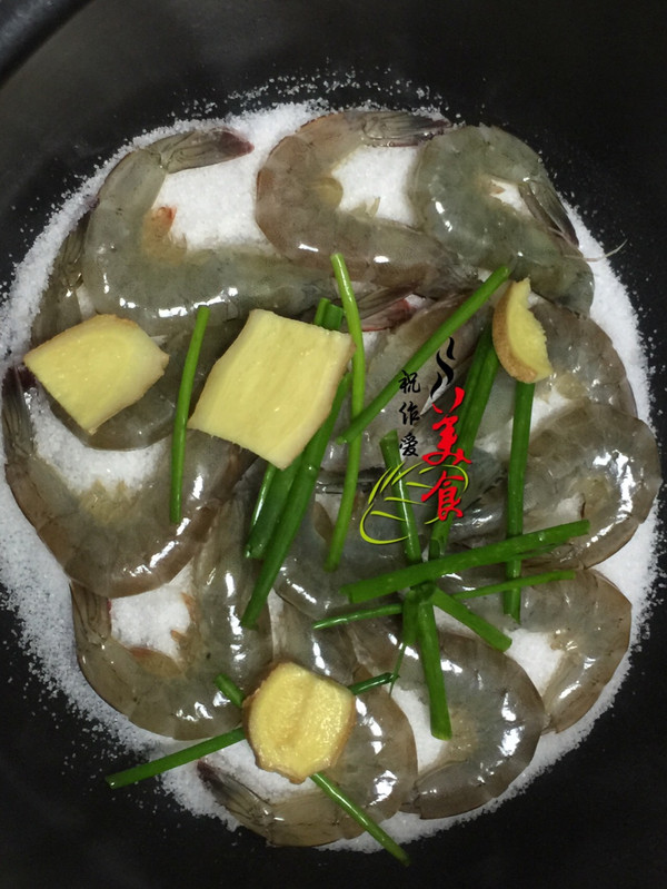 把海盐铺在压力锅底部,铺满放入虾和葱姜。