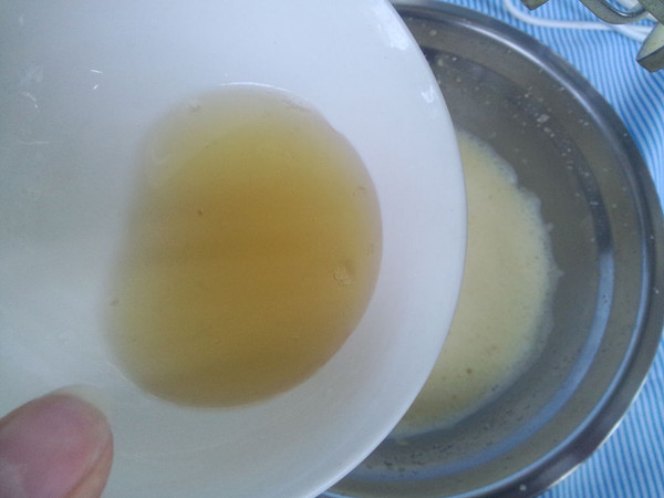 糖水慢慢加入蛋黄液中,边倒边开动电动打蛋器搅打均匀。
