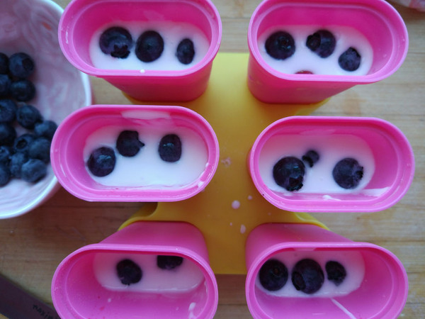 酸奶中加少许牛奶和细砂糖,拌匀,倒入模具中,颠几下震出气泡,放几粒蓝莓。牛奶不要放多,会有冰碴的口感。但是放了牛奶,凝固性更好些,也能是细砂糖溶解得更彻底,减少酸奶的酸味