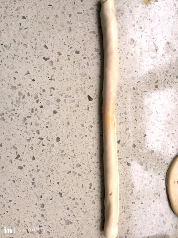 在卷起的面团上稍稍拍点水,撒上芝麻