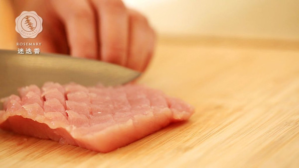 里脊肉从中间横着切开,然后切十字花刀,斜着切不要切断