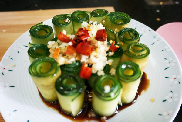 将蒜末,姜末,干辣椒段摆在黄瓜上