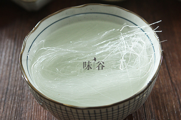 浸泡好的粉丝剪成10厘米长的小段,盘在贝壳上放上扇贝肉。