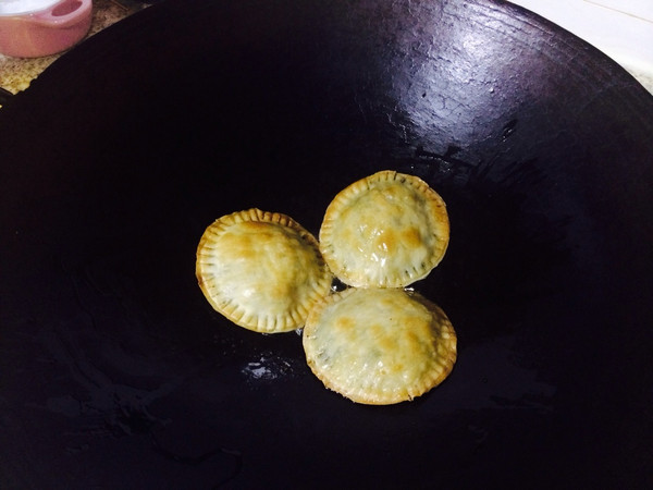 锅内放油烧到六成热,放韭菜盒子,小火油煎成金黄略深,脆一点。