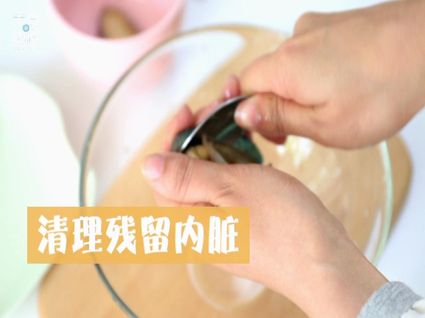 用勺子将粘在鲍鱼壳上的内脏清理干净