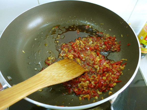 将炒锅烧热放入橄榄油,然后将蒜蓉放入锅中,小火煸炒到大蒜微黄;