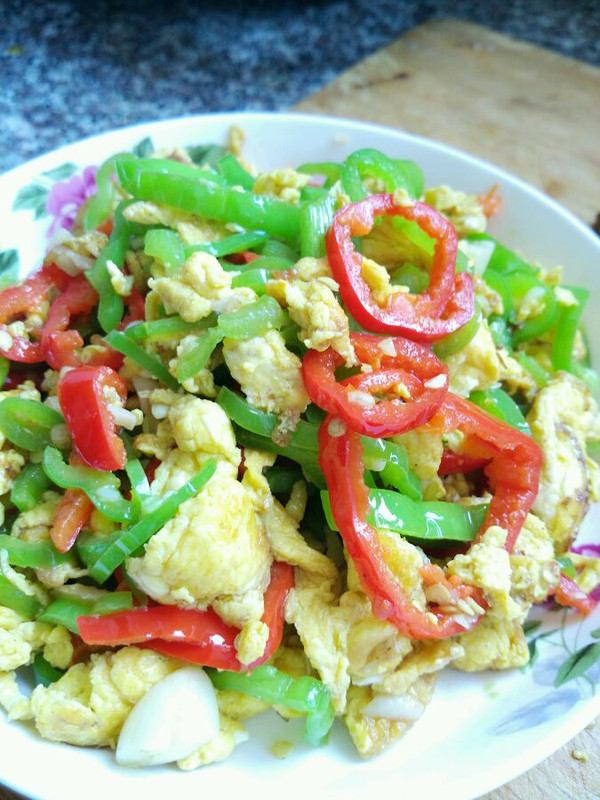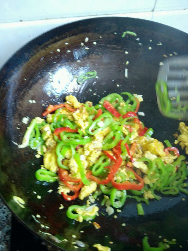 鸡蛋盛出,另放油,油热后放蒜粒爆香后放入青红椒翻炒
