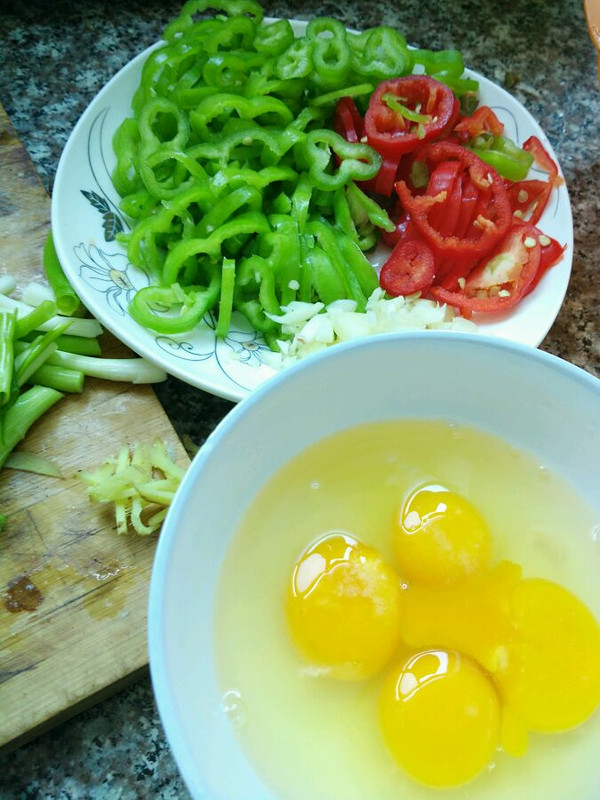 青椒和红椒切圈圈,鸡蛋放少盐打散