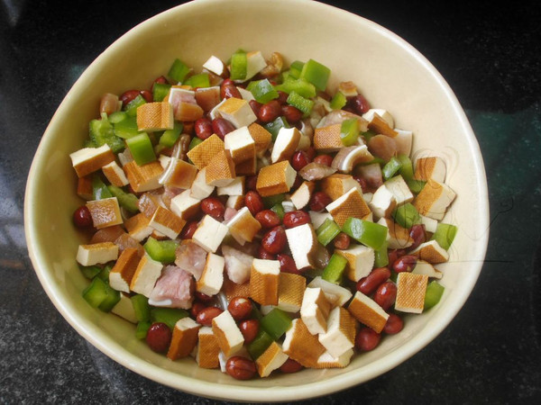 香干入开水中烫熟,切丁;青椒切丁