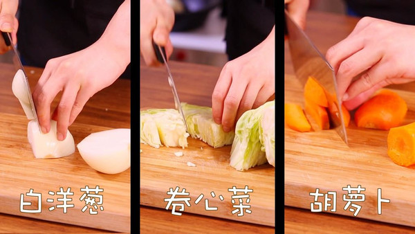 ▲先把卷心菜、胡萝卜、洋葱分别切成小块。