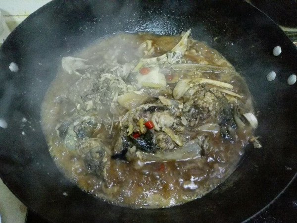 把鱼头下进去,放适量老抽上色,放大半碗清水,以没过鱼头为宜,大火烧开,放料酒煮下,然后放适量盐,醋,转中火盖锅盖焖煮。